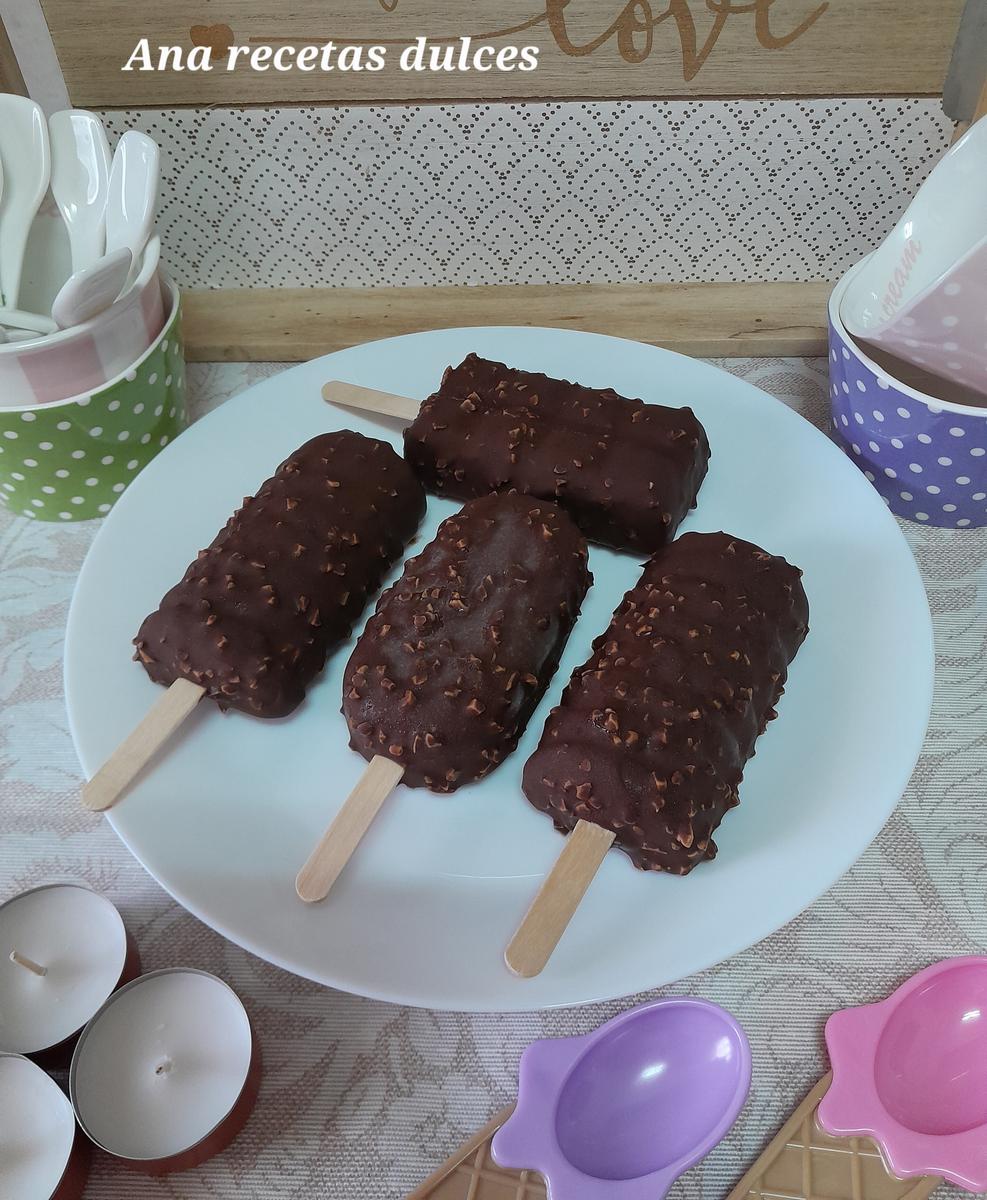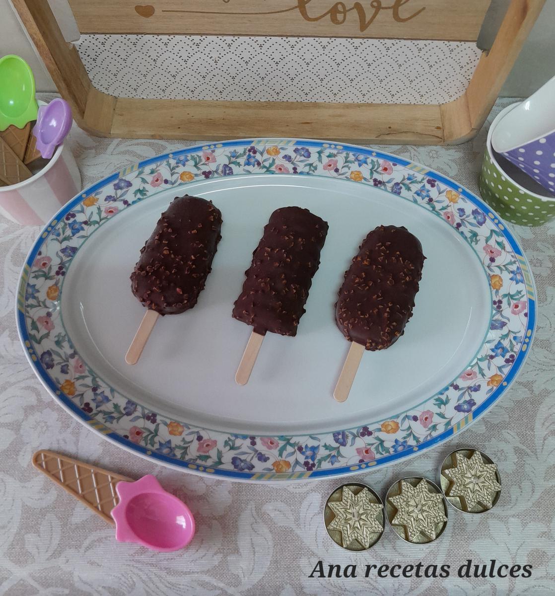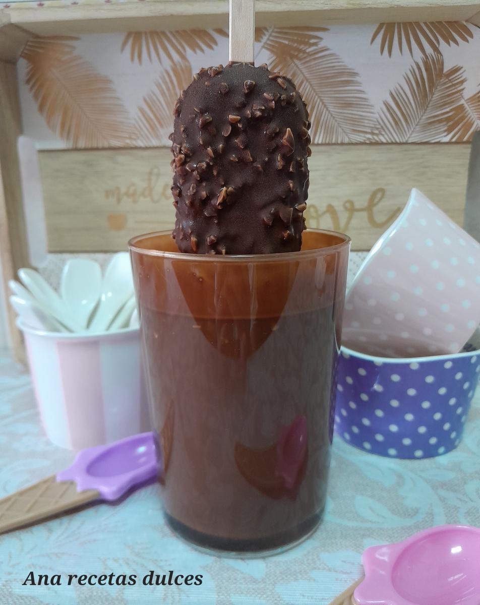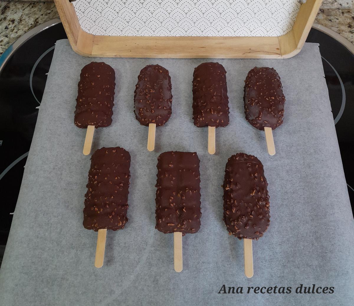Vertemos el chocolate en un vaso alto, desmoldamos los helados y los vamos introduciendo en el chocolate, escurrimos un poco y los vamos poniendo sobre papel de horno mientras bañamos el resto.