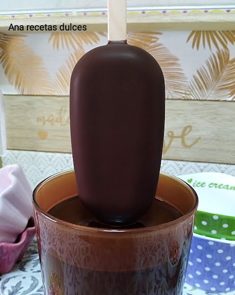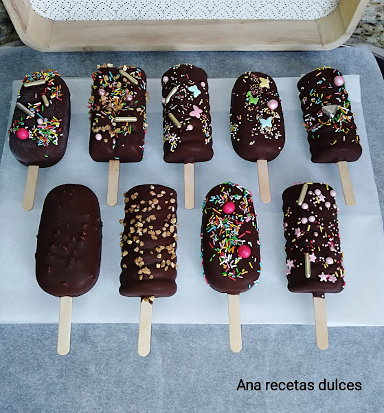 Pasado el tiempo, vertemos el chocolate en un vaso alto, desmoldamos los helados y los vamos introduciendo en el chocolate, escurrimos un poco y inmediatamente decoramos con los sprinkles o las almendras crocanti y los vamos poniendo sobre papel de horno mientras hacemos el resto.