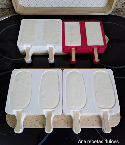 Rellenamos los moldes, insertamos los palitos y tapamos con papel film, metemos en el congelador un mínimo de 8 horas o hasta el día siguiente.