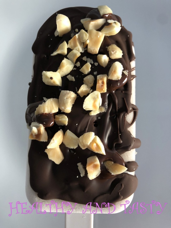 Cuando vayamos a consumirlos, picamos 5 o 6 frutos secos con un cuchillo y derretimos 2 onzas de chocolate negro en el microondas durante un minuto. Estas cantidades son para un helado. Hacemos lo mismo con cada helado. Desmoldamos los helados y los cubrimos del chocolate derretido e inmediatamente lo espolvoreamos con los frutos secos picados. Debemos ser rápidos porque el chocolate se enfría rápidamente y debe estar tibio para que se mantengan los frutos secos pegados a él.