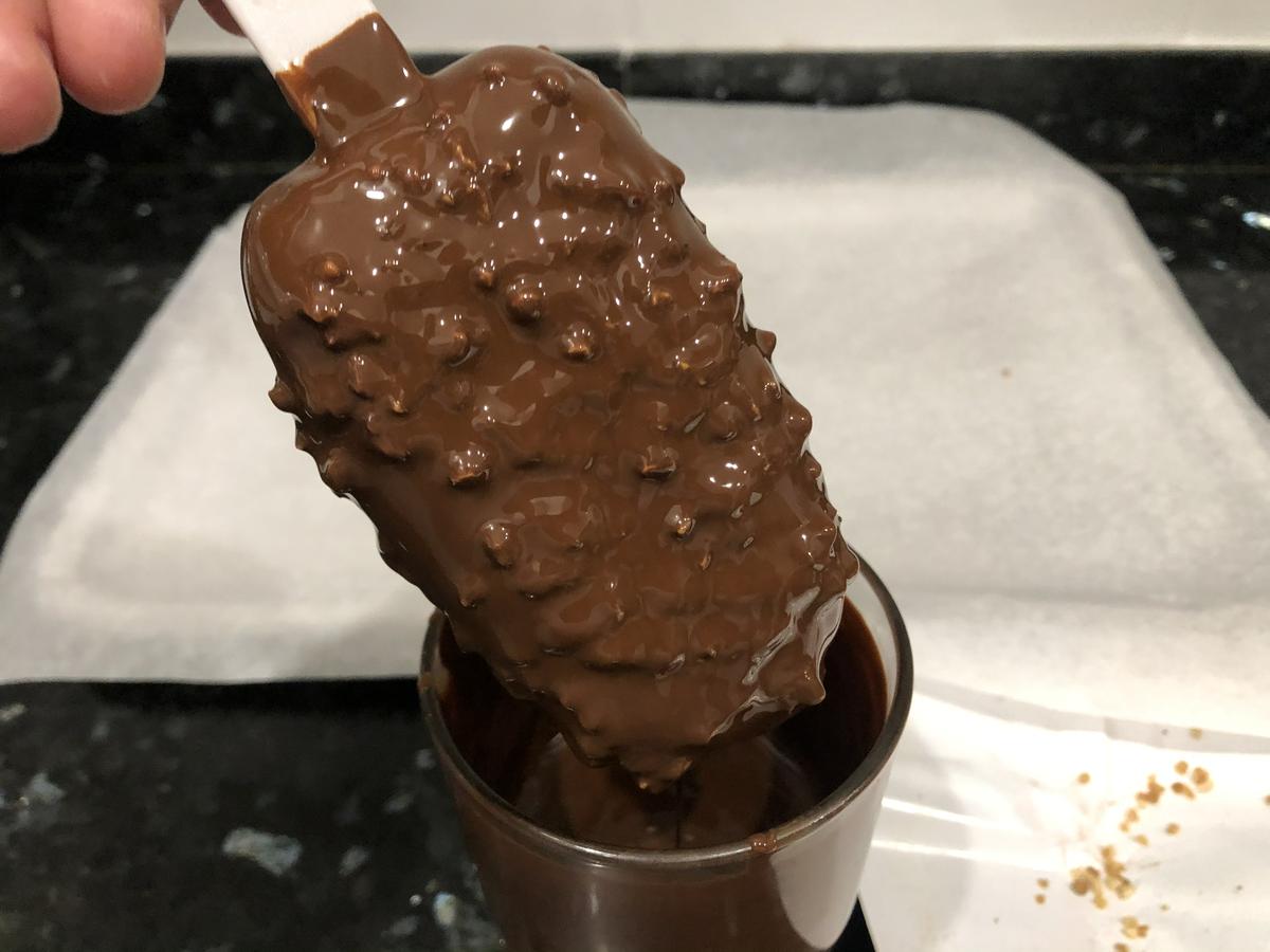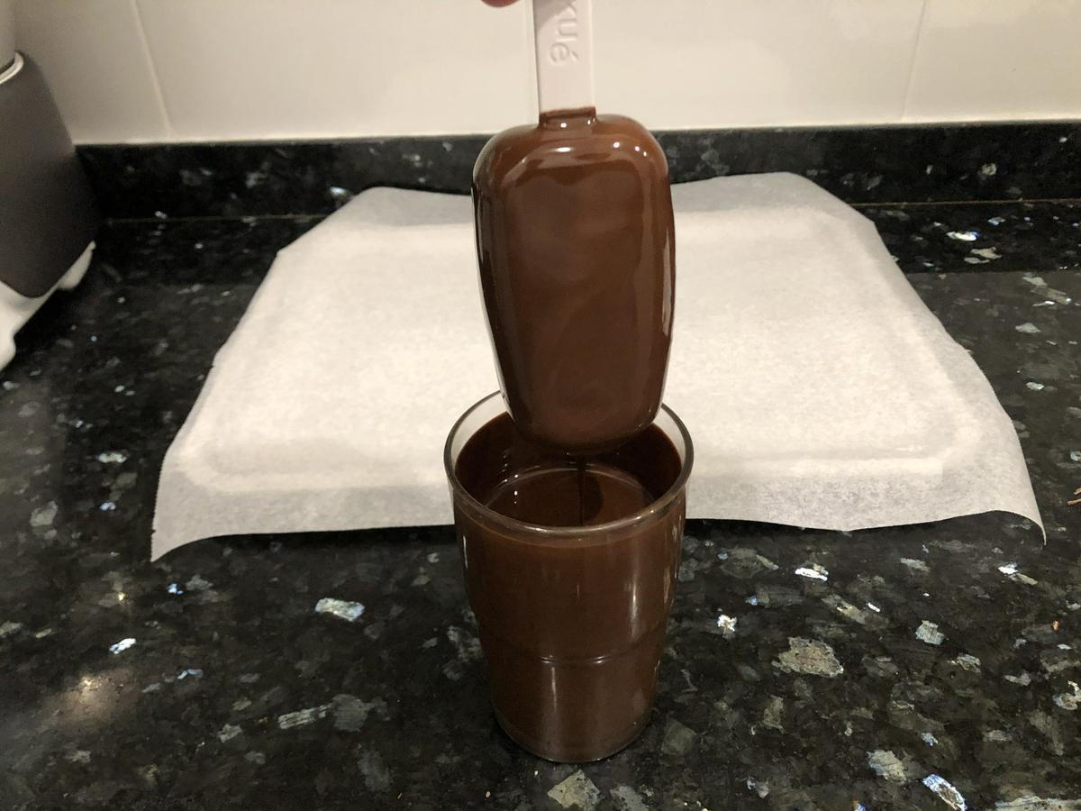 4. Vamos bañando los helados en el chocolate, escurrimos y cuando lo veamos solidificado, dejamos en un plato o bandeja sobre papel vegetal mientras bañamos el resto.