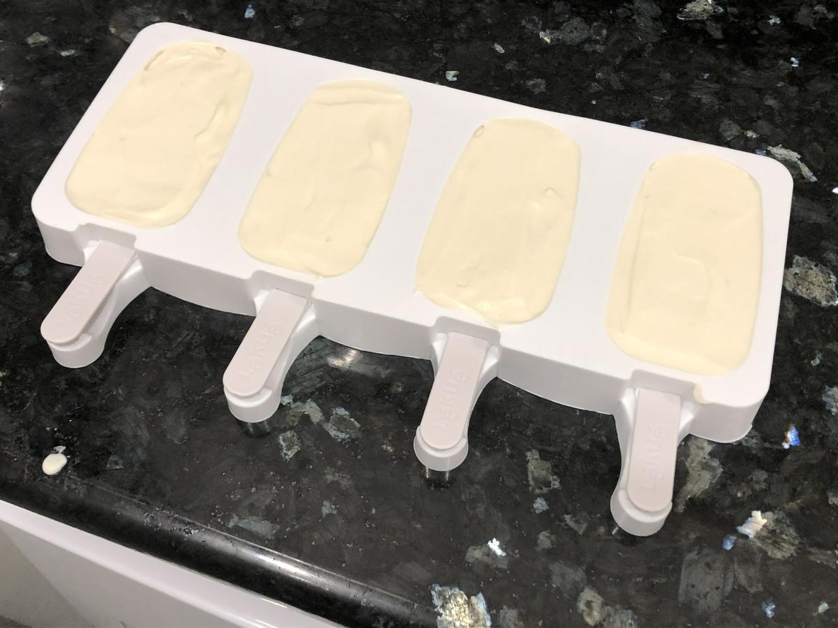3. Repartimos la mezcla en los moldes de helado sin llegar a llenarlos del todo. Introducimos los palos en los huecos del molde destinados a ello y terminamos de rellenar dejándolo lo más liso posible. Tapamos con film y guardamos en el congelador durante al menos 8 horas, pero mejor si lo dejamos de un día para otro. De la mezcla, nos ha sobrado un poquito que hemos dejado en un envase y hemos congelado tal cual.