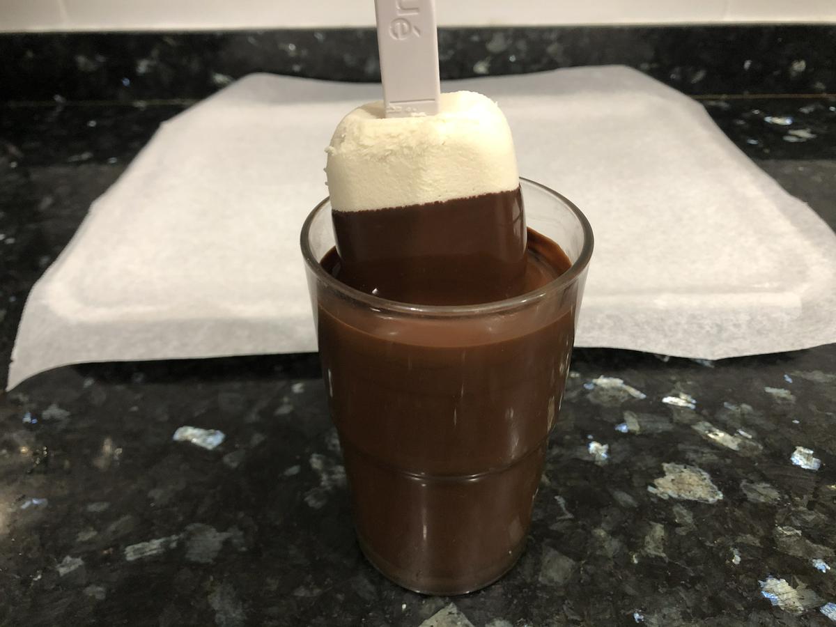 Yo directamente lo he fundido en el mismo vaso donde luego los he bañado. Como no cabía todo el chocolate, he ido poniendo y a medida que se iba fundiendo, añadía un poco más y así hasta tenerlo todo bien fundido, completamente fluido.