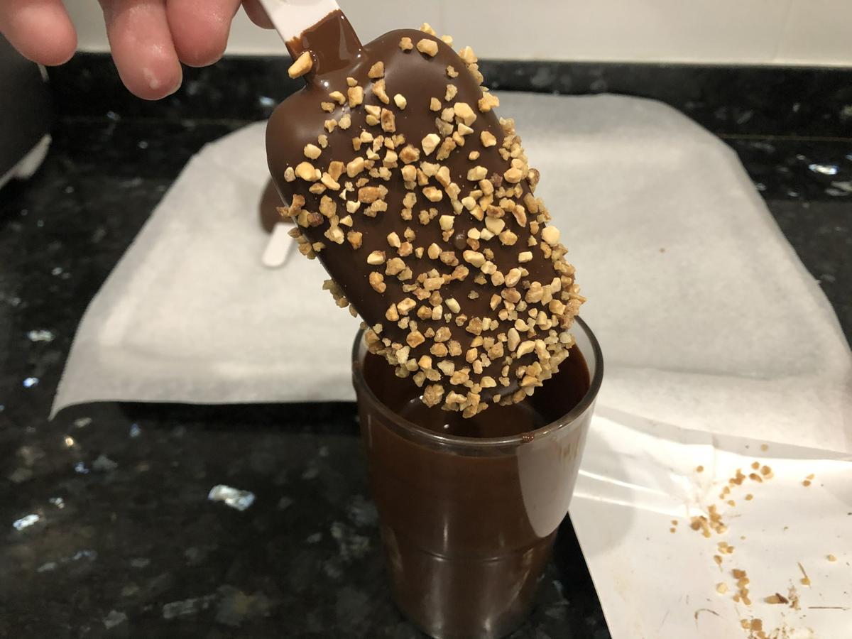 4. Vamos bañando los helados en el chocolate, escurrimos y cuando lo veamos solidificado, dejamos en un plato o bandeja sobre papel vegetal mientras bañamos el resto.
