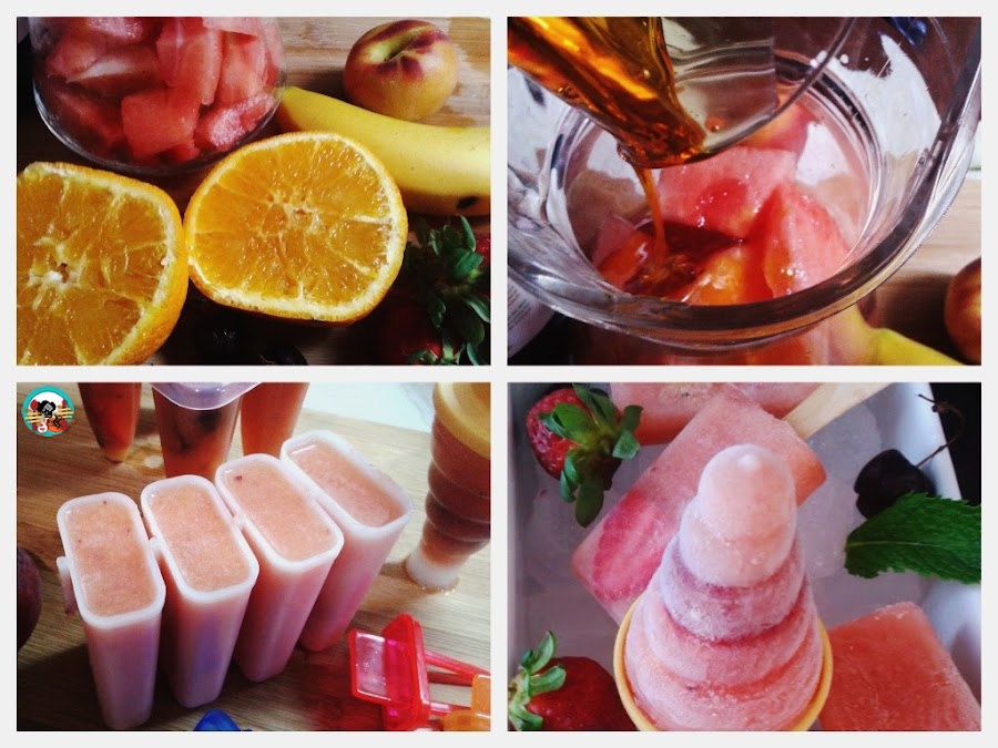 1.- En el vaso de la batidora ponemos la sandía picada, añadimos la miel, el melocotón, 1/2 plátano, 3 frezas y 2 cerezas. Lo trituramos todos, incorporamos el zumo de naranja colado y el vino. Vertemos esta mezcla en moldes de helados. Cortamos trozos de fruta y los introducimos en los moldes. Guardamos en la nevera 5 o 6 horas.