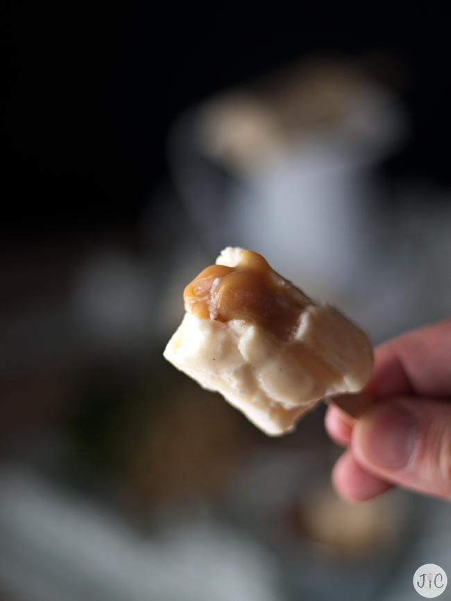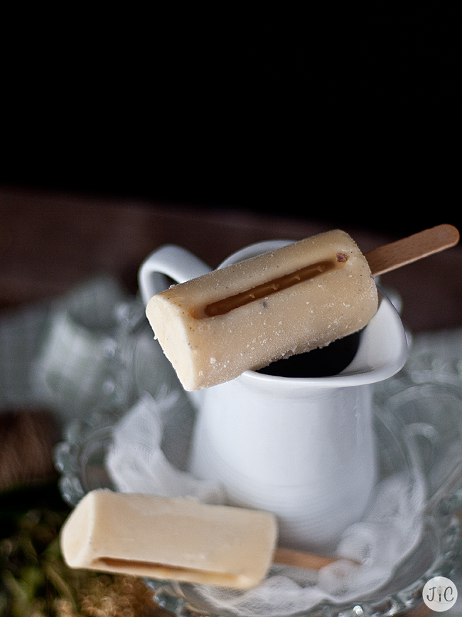- Pasado el tiempo, desmoldamos con cuidado. En los huecos de los helados, echamos un poco de caramelo con la ayuda de una manga pastelera.