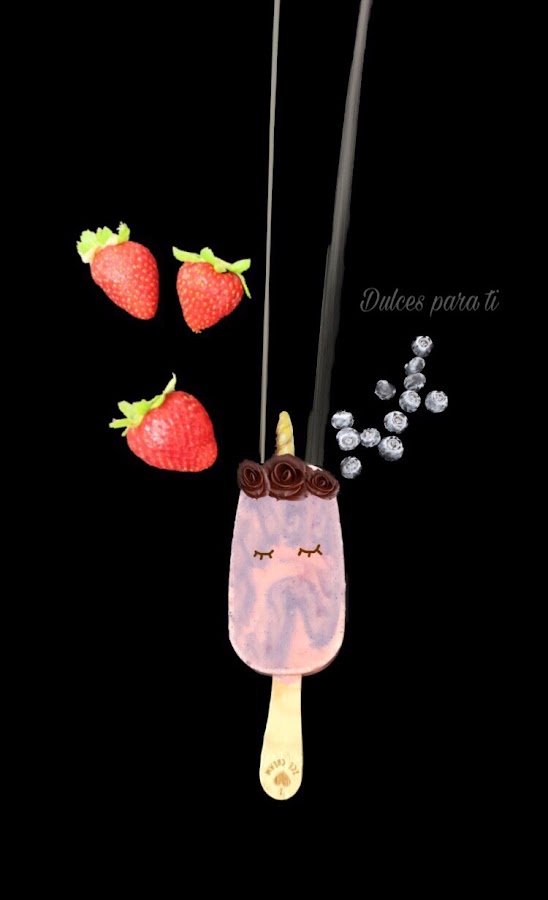 Yo he dividido el yogur en tres partes para tener los diferentes colores, primero he mezclado el yogur con el azúcar y luego lo he dividido en tres, unos 82 gr en cada parte, una parte la dejamos sin nada más, a otra le añadimos los arándanos, trituramos y reservamos y hacemos lo mismo con las fresas. Ponemos un poco de cada mezcla en nuestros moldes de helados y los llevamos a la nevera unas 2 horas, decoramos con chocolate los ojos y con fondant el cuerno y las flores y ya tenemos listos nuestros deliciosos helados, seguro que sí los hacéis quedáis más que contentos con esta deliciosa receta, espero que los hagáis y me contéis que os han parecido, dulces besitos a todos y gracias por leerme.