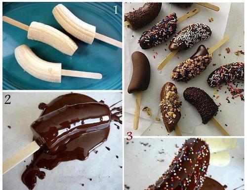 Helado Natural de banana, bañadas en chocolate y toppings Alguno de los toppings o agregados como ser las frutas secas, en poca cantidad son muy buenas, mas aún si las tostaste porque liberan aceites buenos que te ayudan a bajar el colesterol malo y subir el bueno, estas son fuentes de Omega 3 y 6. y desde ya podes usar semillas de Lino, Chia, con el mismo fin.
