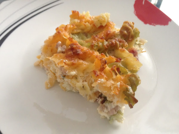 4º - Cuando la pasta quede al dente , la introducimos en una fuente para horno , le sumamos la carne picada , la cebolla , los taquitos de jamón , y bañamos todo con la salsa 4 quesos y los huevos batidos . Removemos bien para mezclar todos los ingredientes .