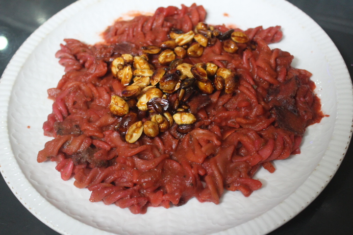 Hoy os traigo un plato espectacular, con muy poco trabajo, partiendo de unas simples hélices de pasta, un sofrito congelado y unos frutos secos un poco húmedos glaseados.