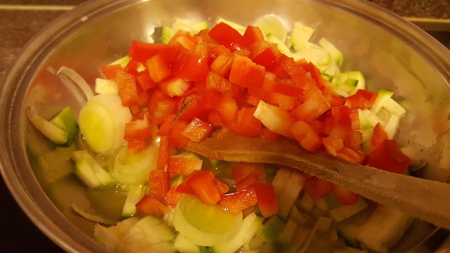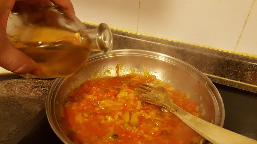3.- Cuando las tengamos cortadas, ponemos a calentar un poco de aceite en una sartén e iremos añadiendo las verduras poco a poco, reservando el tomate para el final.