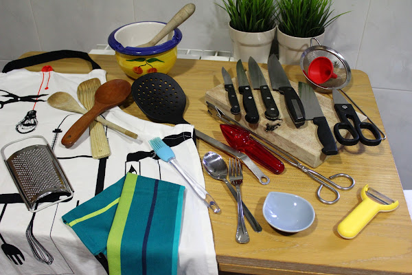 Utensilios de cocina: Delantal, paños, Cuchillos de varios cortes, tijeras, pelador, cucharas, pinzas, mortero...