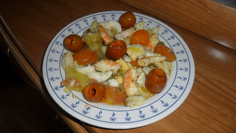 Ponemos a cocer la cola de la merluza una vez descongelada y bien limpia de escamas con un poco de aceite y sal, cocemos también los huevos y zanahoria y la patata a trocitos medianos. Mientras se cuecen, vamos pelando y troceando los langostinos cocidos y el tomate que partido a groso modo.