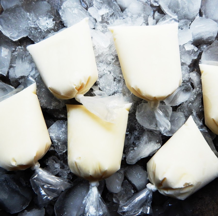 Llenamos las bolsitas con aproximadamente una taza de la mezcla y con una cuchara agregamos un poco del coco rallado, ya que casi todo se va al fondo. Hacemos un nudo a la bolsa y repetimos el proceso hasta terminar. Llevamos al congelador.