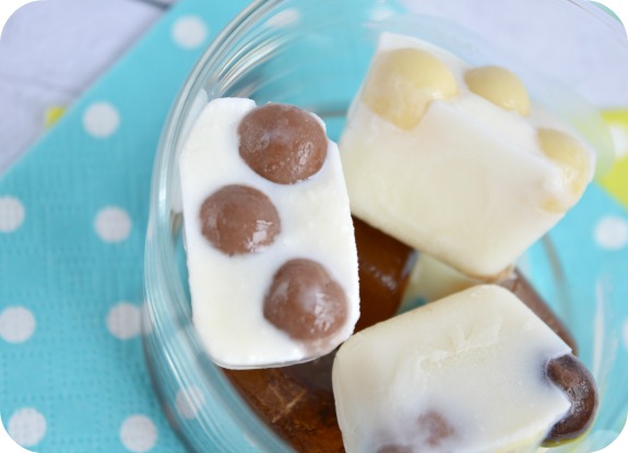 Pon 3 bolitas en cada cubitera ( iguales o combinadas ) y añade leche hasta llenar toda la cavidad. Repitelo con todas y llévalo al congelador hasta que estén listos.