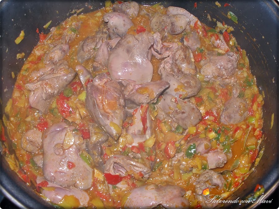 Ahora en el mismo aceite refreímos la verdura y luego le añadimos los higadillos y el vino blanco.