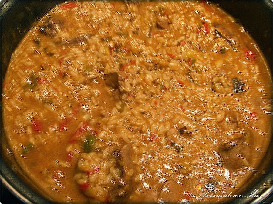 Dejamos pochar a fuego medio un par de minutos y añadimos el arroz que se empape bien.