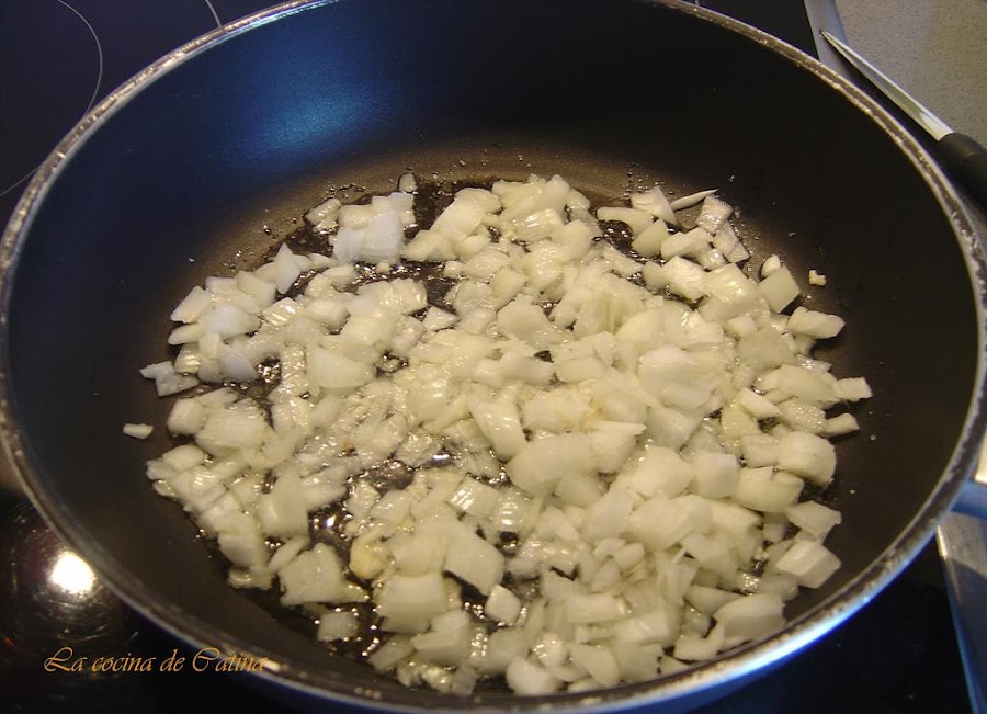 En la misma sartén, añadir la cebolla y el ajo y freír a fuego suave durante unos diez minutos hasta que esté blanda y dorada ligeramente.