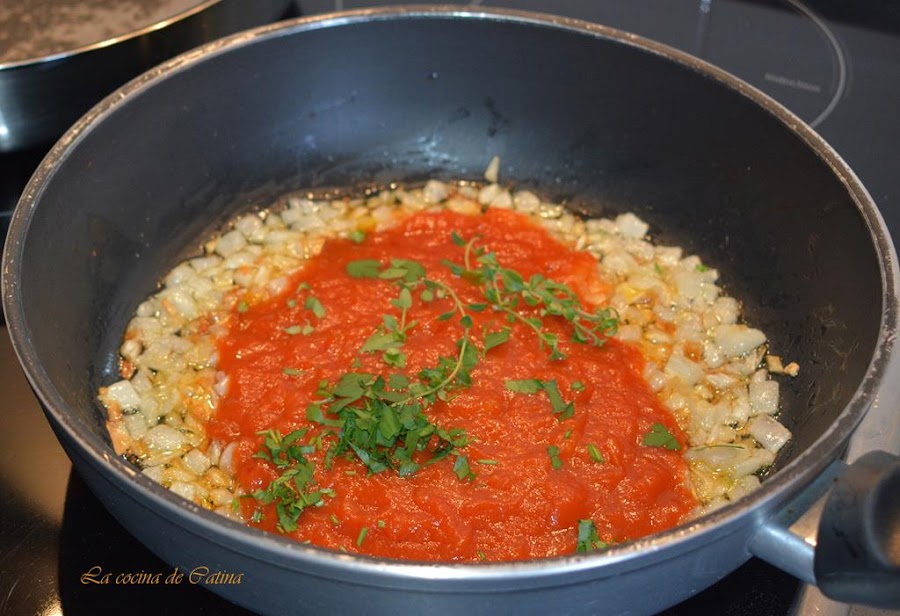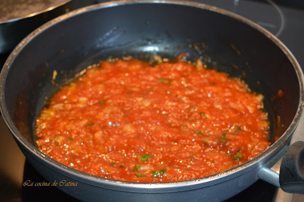 Añadir los tomates, sal al gusto y seguir friendo durante 10 minutos más. Por último le añadimos el tabasco, el perejil y el tomillo, mezclamos bien.