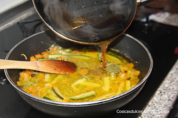 Cuando veamos que ya está pochado añadimos el calabacín en bastones, los zumos y la piel rallada de naranja y limón, el jengibre, la pimienta y el laurel.