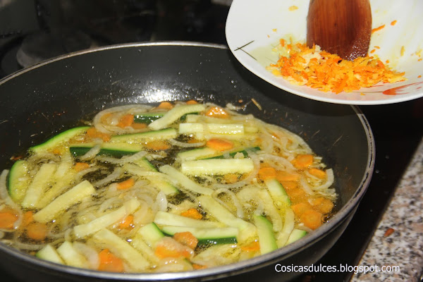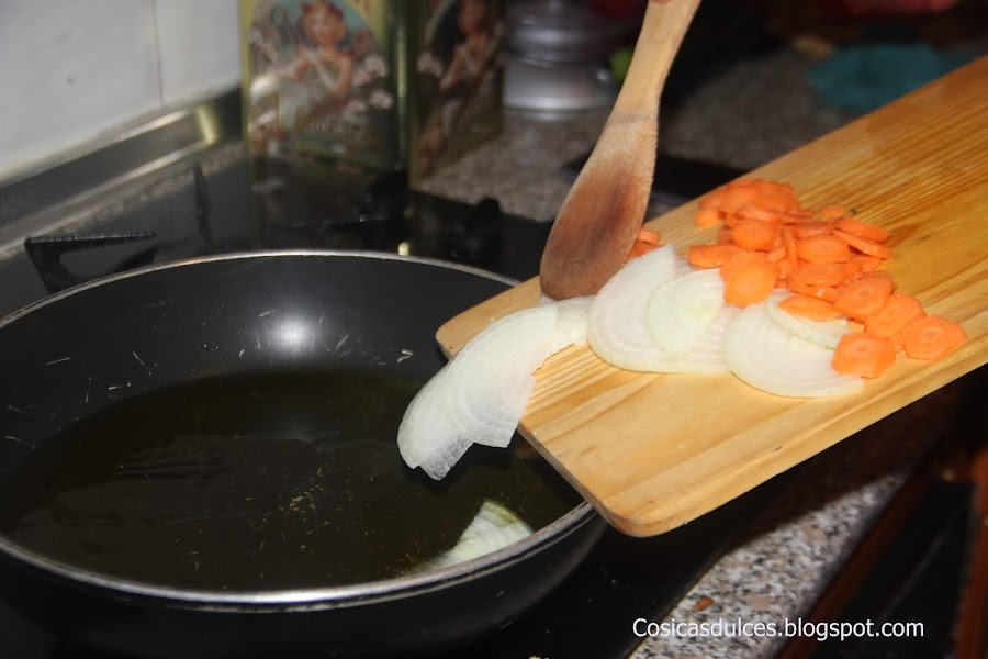 En una sartén colocamos la cebolla cortada en juliana y la zanahoria en láminas finas.