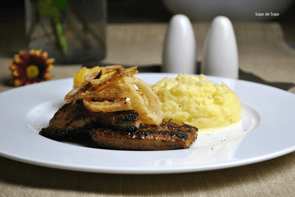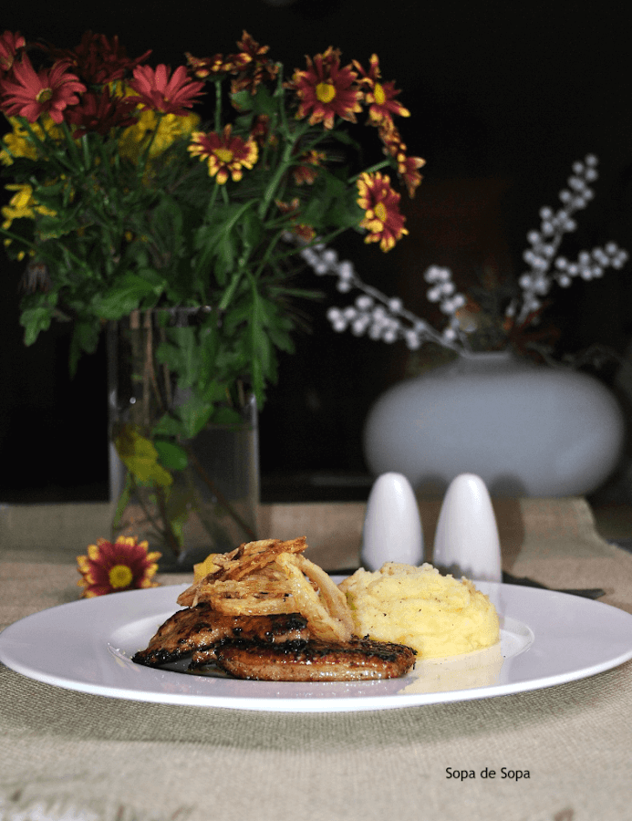 En este caso también lleva cebolla pero frita aparte, además una compota de manzana que le queda de 10 y un puré de patatas con un toque especial, siendo éste el acompañamiento ideal para este plato.