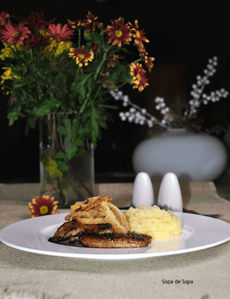 Servir; Poner en los platos el hígado cubierto con los aros de cebolla. El puré de patatas a un lado al igual que la compota de manzana.