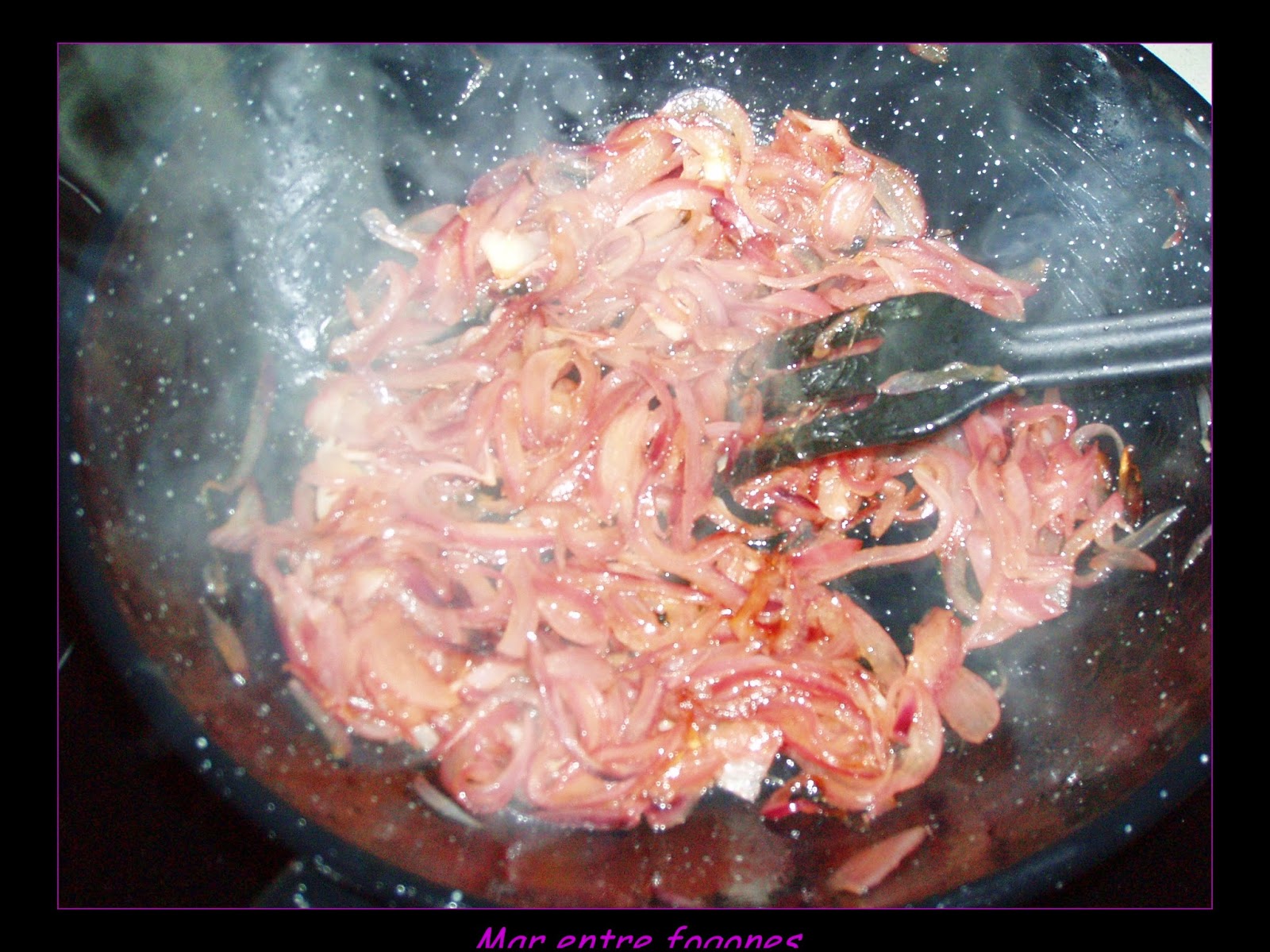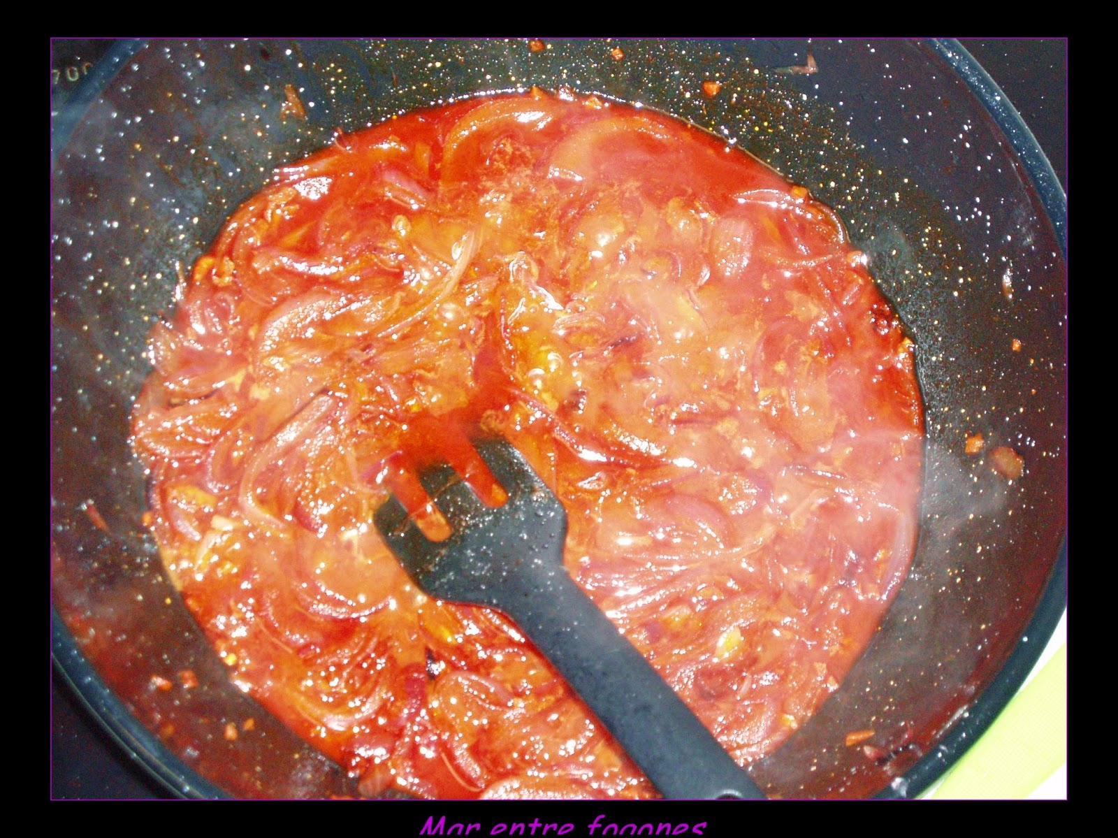 Cuando la cebolla esta bien pochada añadimos la mezcla de vermouth, ajo y pimentón.