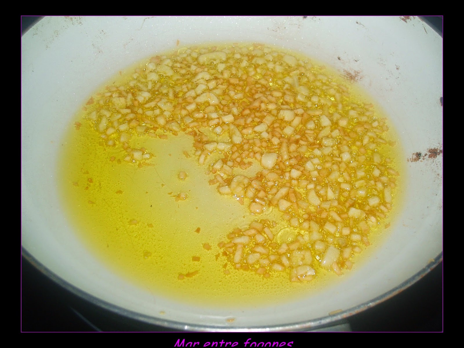 En otro sartén ponemos el ajo con un poquito de aceite y dejamos que se dore.