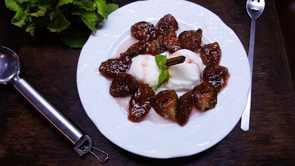 2.-Servimos los higos con unas bolas de helado de queso mascarpone, lo decoramos con una rama de canela y unas hojas de hierbabuena fresca.