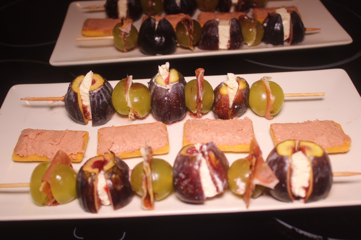 Para cenar, hace unas semanas, se me ocurrió preparar estas originales y ricas brochetas acompañadas de unas rebanadas de pan tostado untado de foie gras.