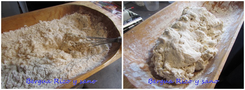 3. Incorporamos la harina y vamos mezclando bien para que se humedezca todo; cuando ya tengamos toda la harina mezclada, pasamos a una superficie limpia para amasar.