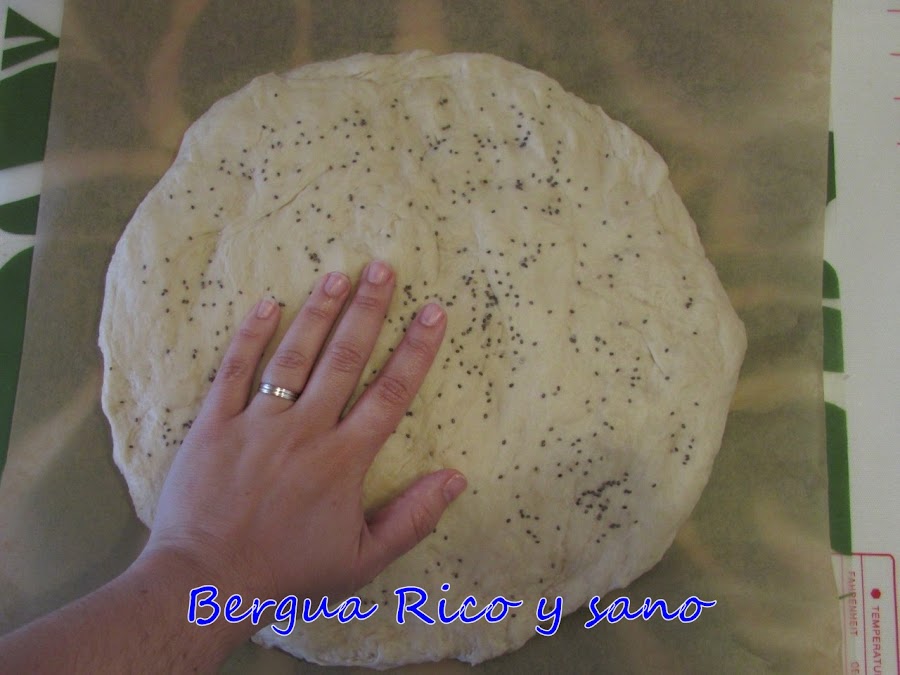 6. Pasado ese tiempo desgasificamos masajeando la masa y a la vez le vamos dando forma sobre papel de hornear; aplanamos hasta que la masa tenga unos 2 cm de altura y formamos un círculo. Cuando aplanamos es el momento ideal de espolvorear con las semillas de sésamo negro, porque así al apretar ligeramente con la mano, quedan incrustadas y no se caen.