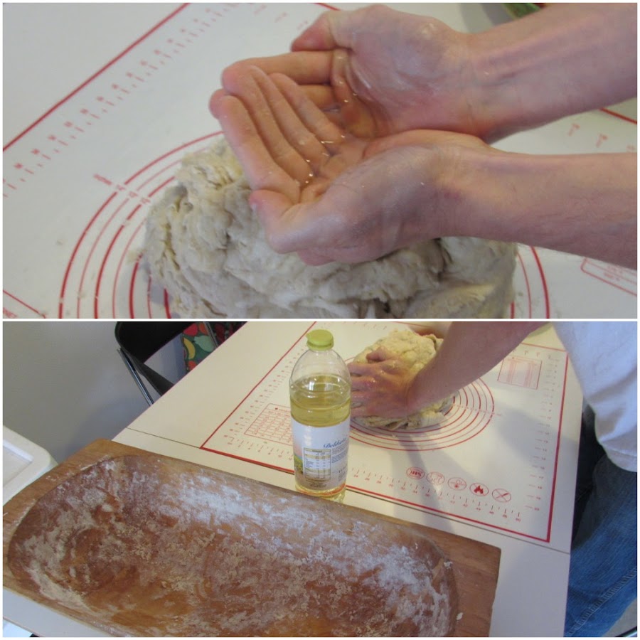 4. Durante el amasado hará falta añadir aceite varias veces a la masa para que no se quede seca y poder trabajarla; el aceite se echa en la palma de la mano, nos engrasamos la otra mano y a amasar hasta que la masa quede uniforme. El amasado lo hizo, como decía, mi vikingo.