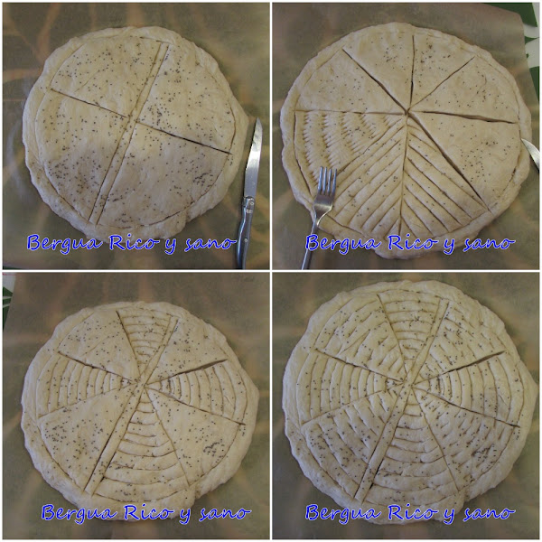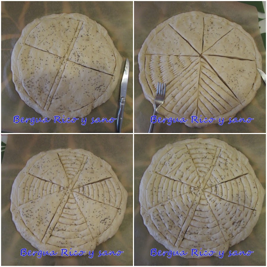 7. Lo siguiente es decorar. Los motivos suelen ser líneas hechas con cuchillo fino de sierra y a veces tenedor; os enseño algunos modelos en mis dos ruedas. El corte debe ser profundo, o no se marcará; la masa se volverá a unir una vez crezca en el horno, así que, sin miedo.