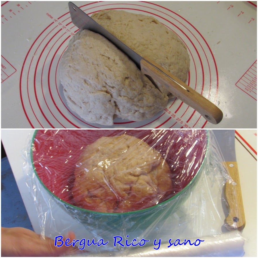 5. Cortamos la masa en dos mitades y ponemos cada una en un cuenco hondo para que leven. No queremos que se sequen al contacto con el aire, así que recomiendo tapar (pero dar espacio suficiente para que la masa crezca), por ejemplo con papel film de cocina.