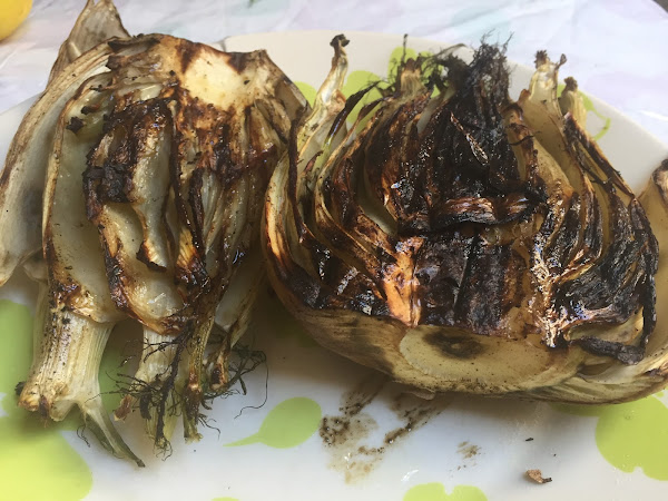 Cortas en 2 a lo largo el hinojo , lo pintas con aceite , sal pimienta y al fuego una vez que lo notas dorado, lo das vuelta y otra vez sal pimienta y aceite , aproximadamente en 30 minutos ya estará cocido.