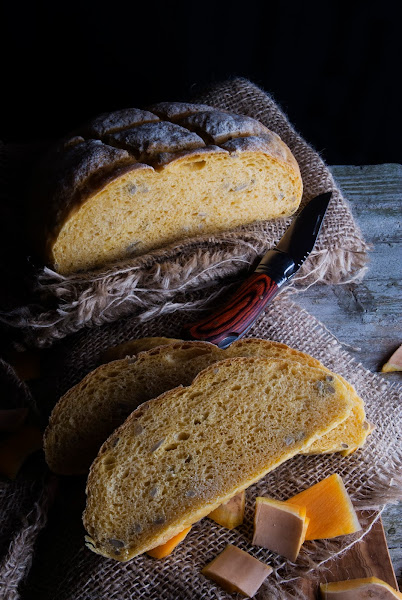 El pan que hoy te traigo, como bien has leído, es una hogaza de calabaza y pipas. Va perfecto para esas tostadas mañaneras (los que seáis de desayunos salados) o cenas ligeras.