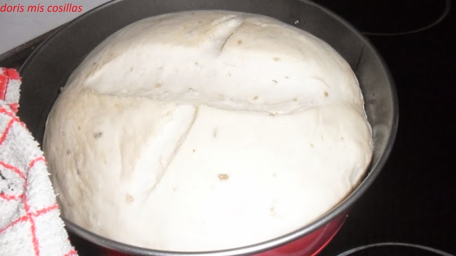 Como hace frío y mucha humedad, he calentado un poco el horno unos minutos y luego lo apagamos .Pincelamos con un poco de leche la superficie del pan o con un poco de aceite y lo dejamos en el horno apagado hasta que doble su volumen tapado con un paño de algodón.