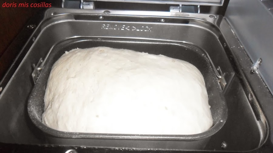 Hacer con los dedos un hueco en la harina y en él desmenuzamos la levadura fresca y tapamos con ella. Encendemos la máquina y damos al programa de amasado y levado. Dura una hora y media y se llama DOUGH.