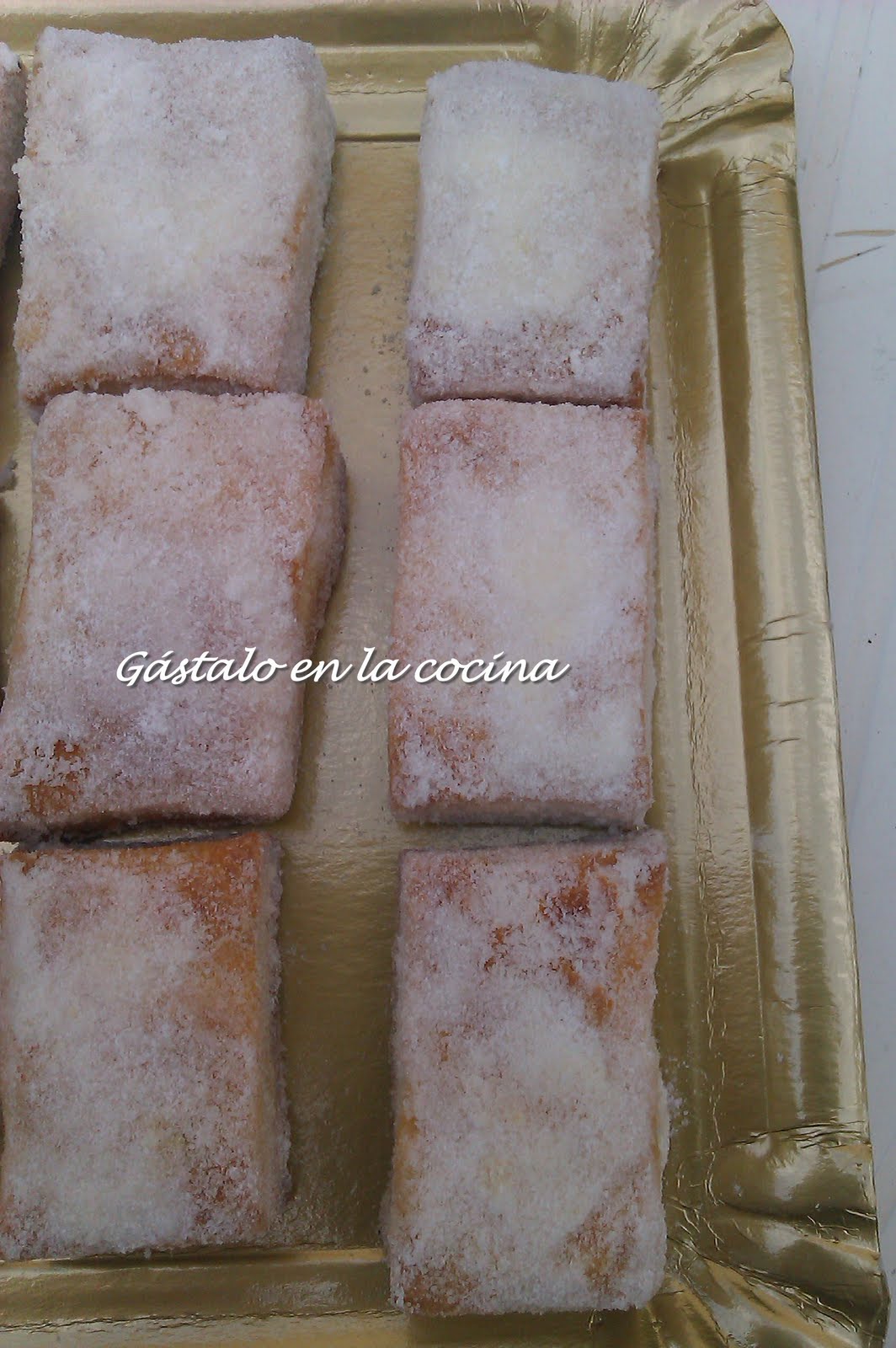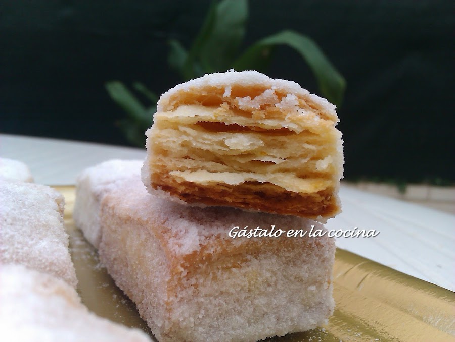 También podeis bañarlos con chocolate después de espolvorearlos con azúcar. La proporción es: 100 de chocolate, 40 de mantequilla y un chorrito de leche, lo meteis en el microondas, sacais, moveis y dejais que temple un poco y napais (dejais caer el chocolate por encima de cada hojaldrada)
