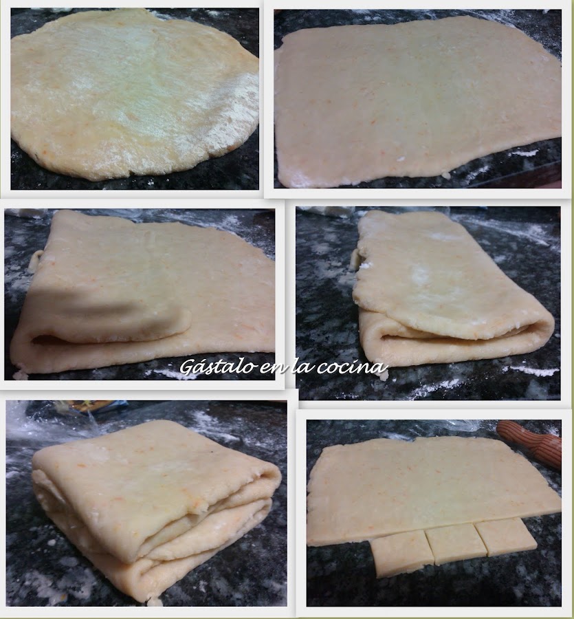 Doblamos la masa de un lado y luego del otro como en las fotos (que queden superpuestos quedando un rectángulo alargado) y después por la mitad (quedando un cuadrado)