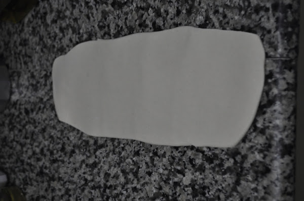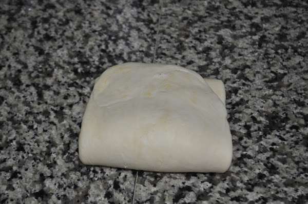 6.- Giramos el paquete 90º y repetimos. Estiramos con el rodillo en una sola dirección hasta tener un rectángulo. Doblamos en tres.