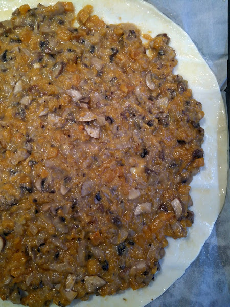 Tenía media calabaza que tenía que aprovechar antes de que se me pusiera mala. Y la combinación de champis y calabaza es de mis favoritas.