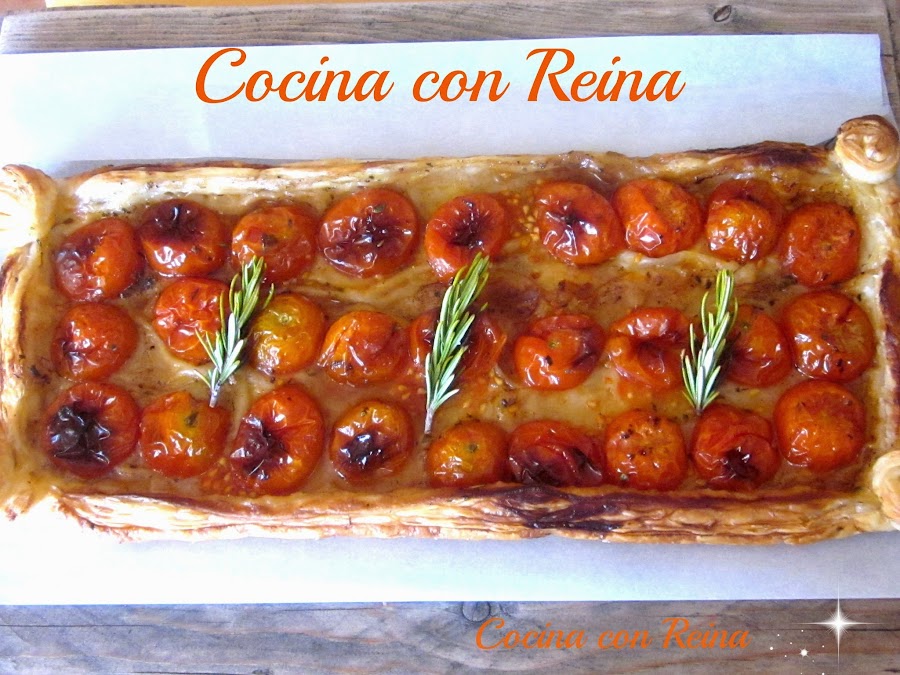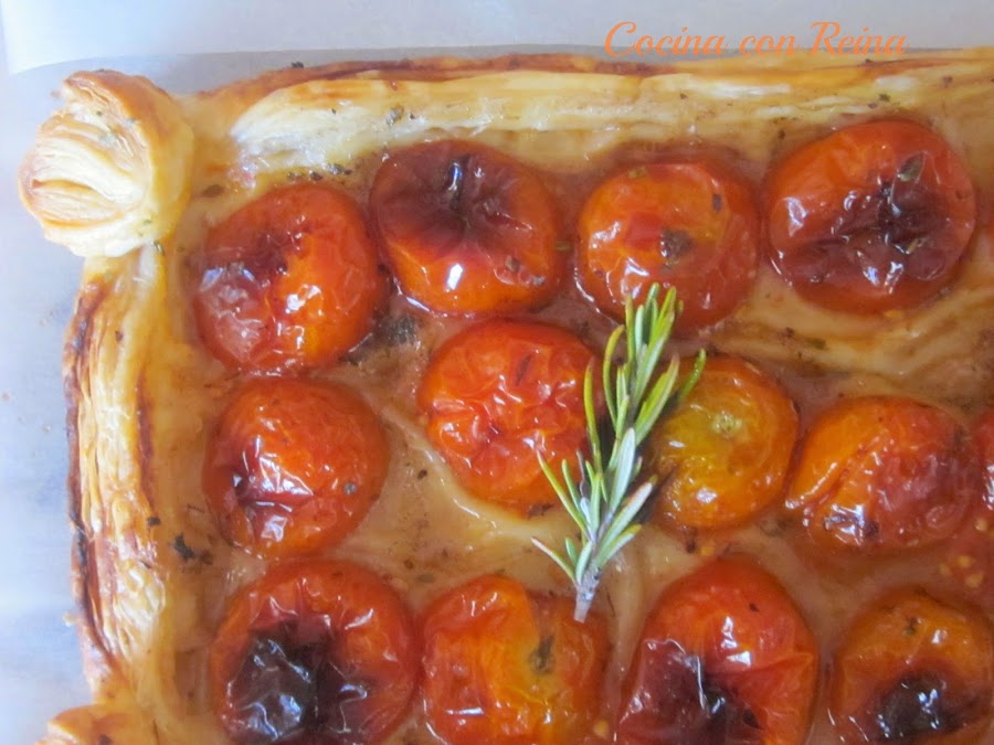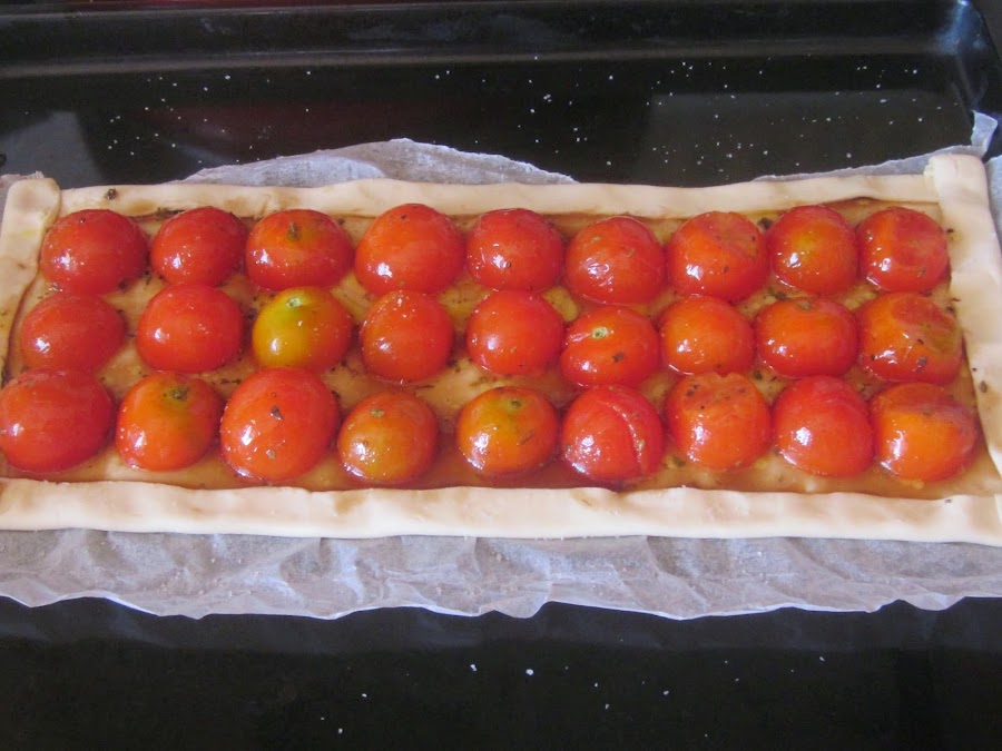 Partimos los tomates cherrys por la mitad y cubrimos el hojaldre, dejando un borde que en mi caso lo he doblado un poco y sellado apretando un poco.