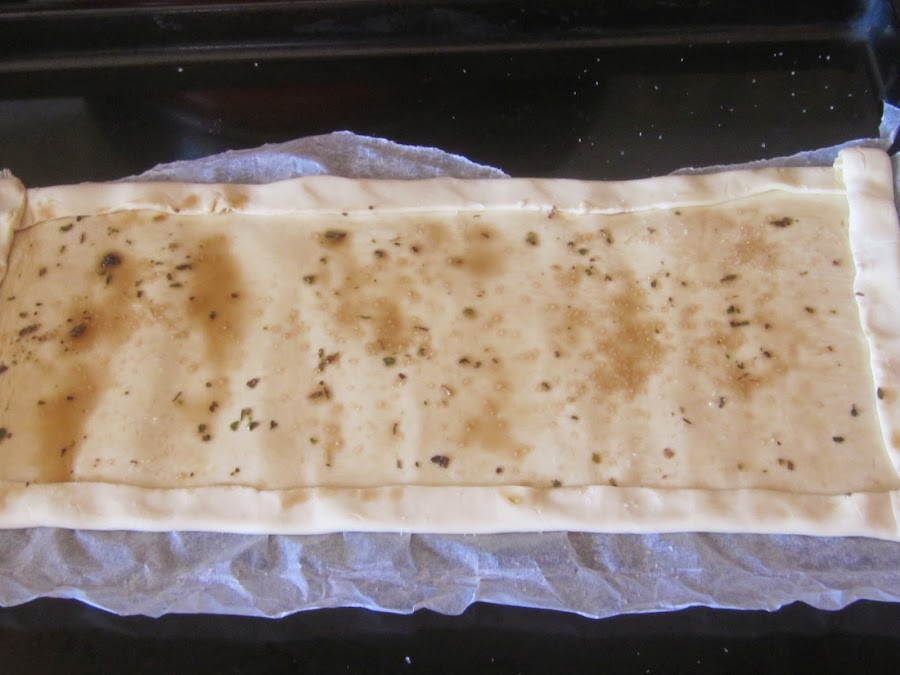 Pintamos el hojaldre con el balsámico y añadimos una pizca de sal.