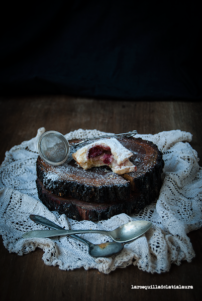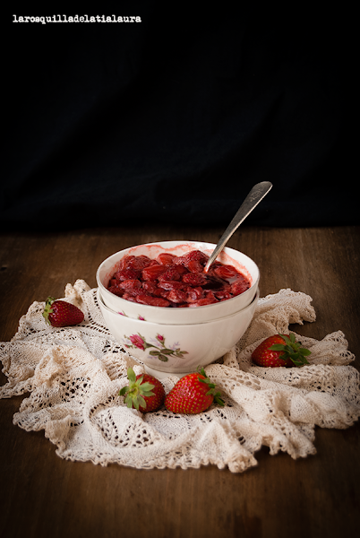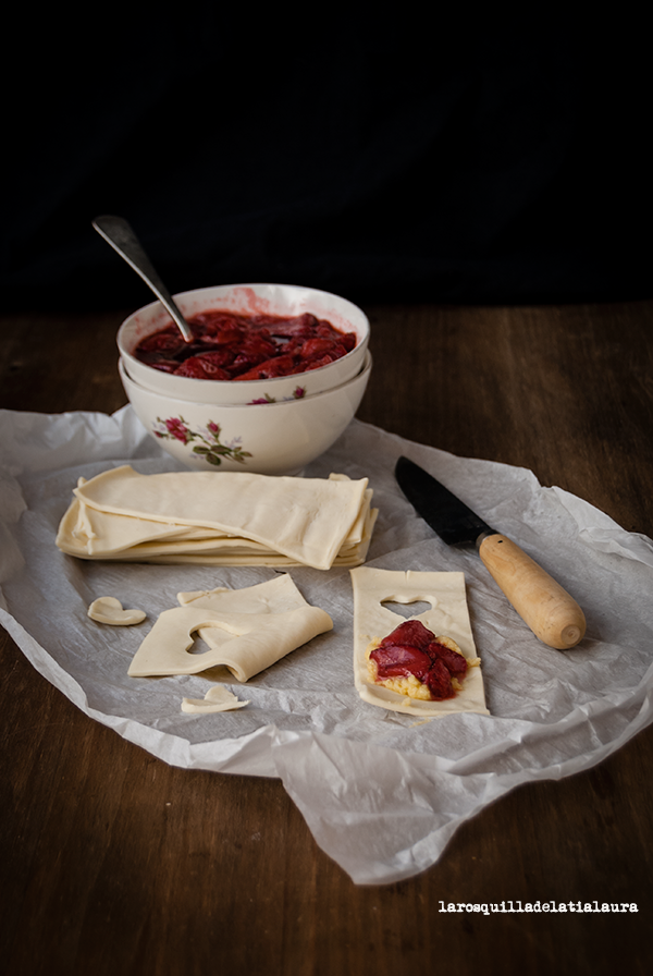 Me encantan las fresas cocinadas, creo que son super versátiles. Están buenas con yogurt, en una rebanada de pan con mantequilla a modo de mermelada...o como relleno de una tarta o hojaldre como este.