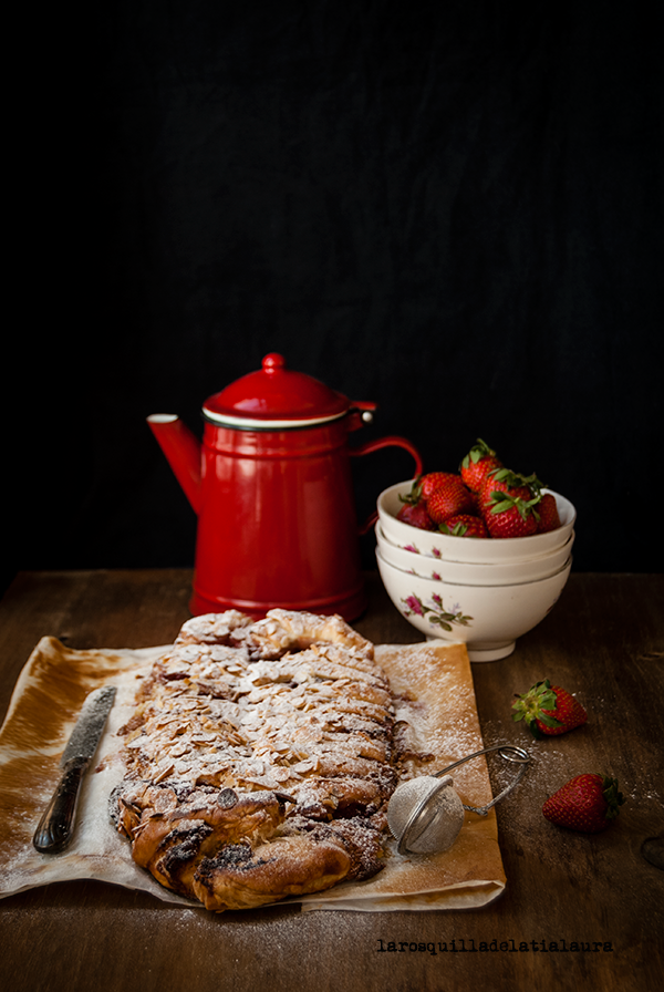 Una deliciosa crema de almendras que te comerías a cucharadas en un ataque de esos nocturnos y unas cuantas fresas y tenemos un postre de reyes. Podemos dejar el relleno preparado el día anterior, para hornear un par de horas antes de comerlo el hojaldre y así dejamos que se enfríe.
