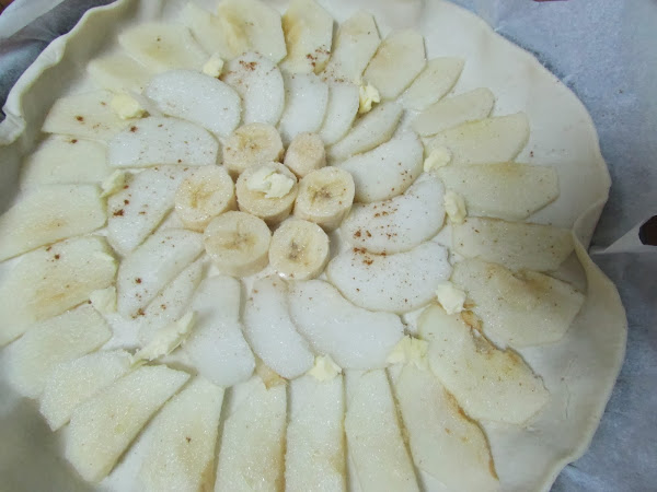 Extendemos la masa, pelamos las frutas, las cortamos y las ponemos por encima