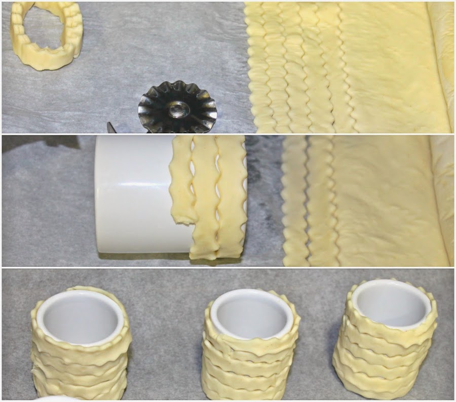 Precalentamos el horno a 180º. Cortamos el hojaldre en tiras. Engrasamos los moldes - en mi caso unas tazas de cortado y vamos enrollando las tiras hasta cubrir la superficie. Presionamos ligeramente las uniones para que no se nos levante el hojaldre al hornear. Colocamos sobre papel de hornear, cubrimos con papel de aluminio para que no se nos queme la parte superior y horneamos por unos minutos. Desmoldamos aun calientes (muy importante).